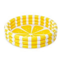 Piscine gonflable Lemon Intex. Profitez de cette nouvelle piscinette Intex au design citron. Parfaite pour les enfants dès l'âge de 2 ans, la couleur acidulée de cette piscine ravira vos enfants. Une vraie vague de fraîcheur les attend. Idéal pour faire découvrir les plaisirs de l'eau en plus petits, elle possède une hauteur d'eau de 23 cm, avec une capacité maximum de 330 L. De quoi s'amuser et se rafraîchir en toute sécurité ! Dimensions (L x l x H) : 147 x 147 x 33 cm
