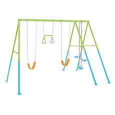 Une aire de jeux spacieuse ! Profitez sans plus attendre du nouveau portique-balançoire 4 agrès Intex : 1 face à face / 2 balançoires / 1 trapèze. Très coloré il se positionnera très facilement dans votre jardin et s'installera rapidement. De quoi faire rêver vos enfants dès l'âge de 3 ans.