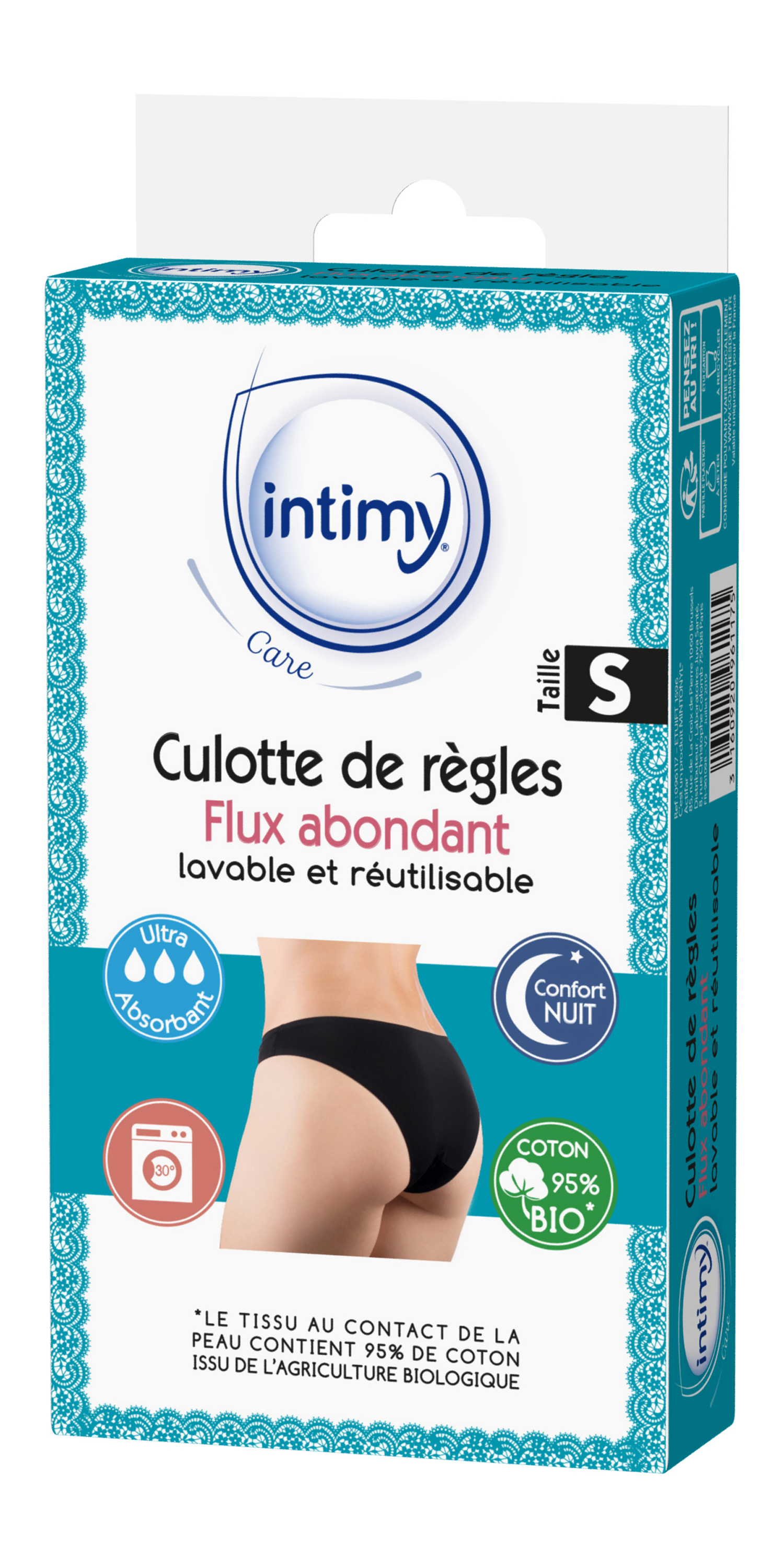La culotte de règles lavable et réutilisable Intimy Care allie sécurité, confort et écologie. La culotte de règles Intimy Care se compose de 3 tissus permettant une absorption équivalente à 3 tampons (25ml). Imperméable et très absorbante, elle vous assurera des nuits tranquilles. La culotte de règles Intimy Care garantit le confort de votre intimité. Le tissu directement en contact avec la peau contient 95% de coton issu de l’agriculture biologique.