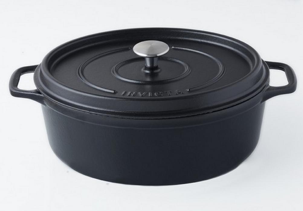 Invicta PUV403351 Daubière Invicta PUV403351 en fonte émaillée avec intérieur noir mat et extérieur 3 couches d'émail pour un entretien facile. Bouton en inox pour résister aux fortes températures du four. Anses larges pour faciliter la prise en main. Couvercle à réserve d'eau et à picots intérieurs