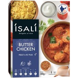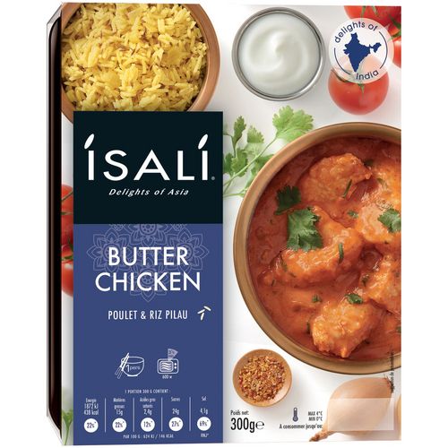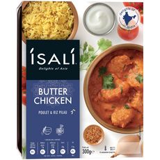 Butter Chicken & Riz Pilau ISALI 300 Gr Le Butter Chicken répond aux amateurs de la cuisine indienne en apportant une nouvelle recette authentique parcourant la route des épices de l'Inde.Préparé dans une sauce au beurre onctueuse au yaourt et épices indiennes.Le tout mélangé à de tendres morceaux de filets de poulet accompagné de riz Pilau.