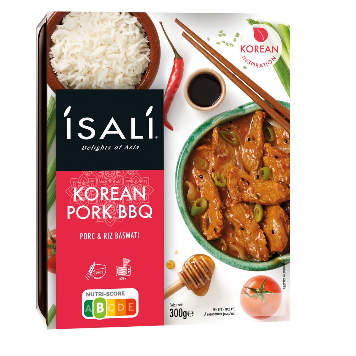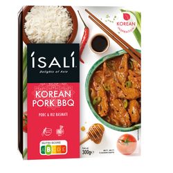 riz basmati, filet de porc, oignons, pulpe de tomates, eau, SAUCE SOJA, pâte de piments rouges, HUILE DE SOJA, sucre de canne, miel, oignons verts, condiments, GRAINES DE SESAME blanc et noir, HUILE DE SESAME, POIVRE NOIR, OEUFS, épaississant E466, gomme guar, gomme xanthane, amidon de maïs, correcteur acidité, lactate de sodium.