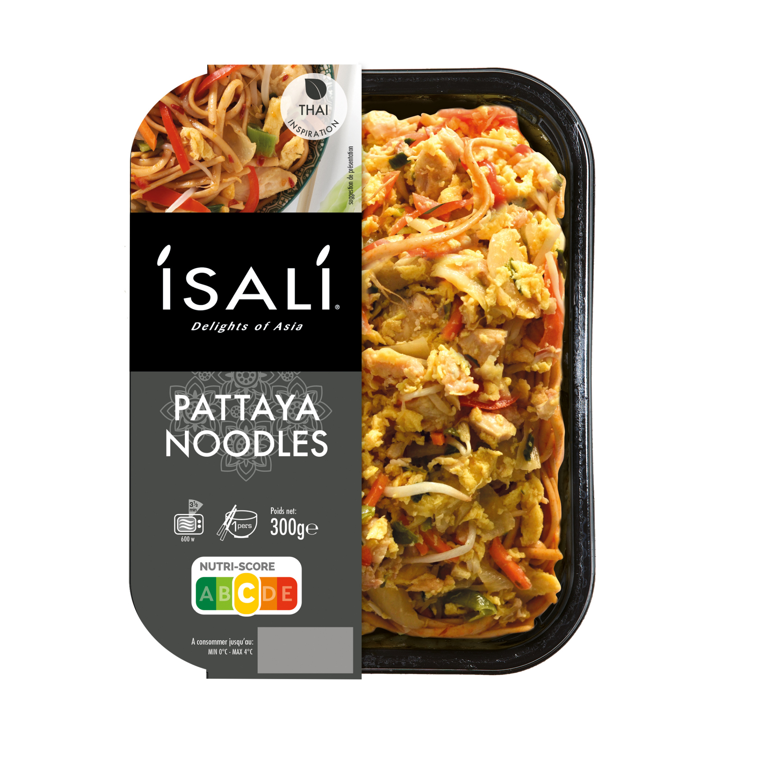 Nouilles (47,3%) (eau, pâte (farine de blé tendre, semoule de blé dur)), mélange légumes (23,6%) (oignons, germes de SOJA, poivrons rouges, carottes , oignons verts, chou vert, poireaux), poulet (10,2%), œufs entiers (7,1%), huile de SOJA, sucre (2,2%), piments rouges (2,0%), tamarin, extrait de poisson, fécule de pomme de terre, huile de tournesol, sel, épices (dont CELERI), émulsifiant: sucroesters d'acides gras, épaississants: gomme guar et gomme xanthane