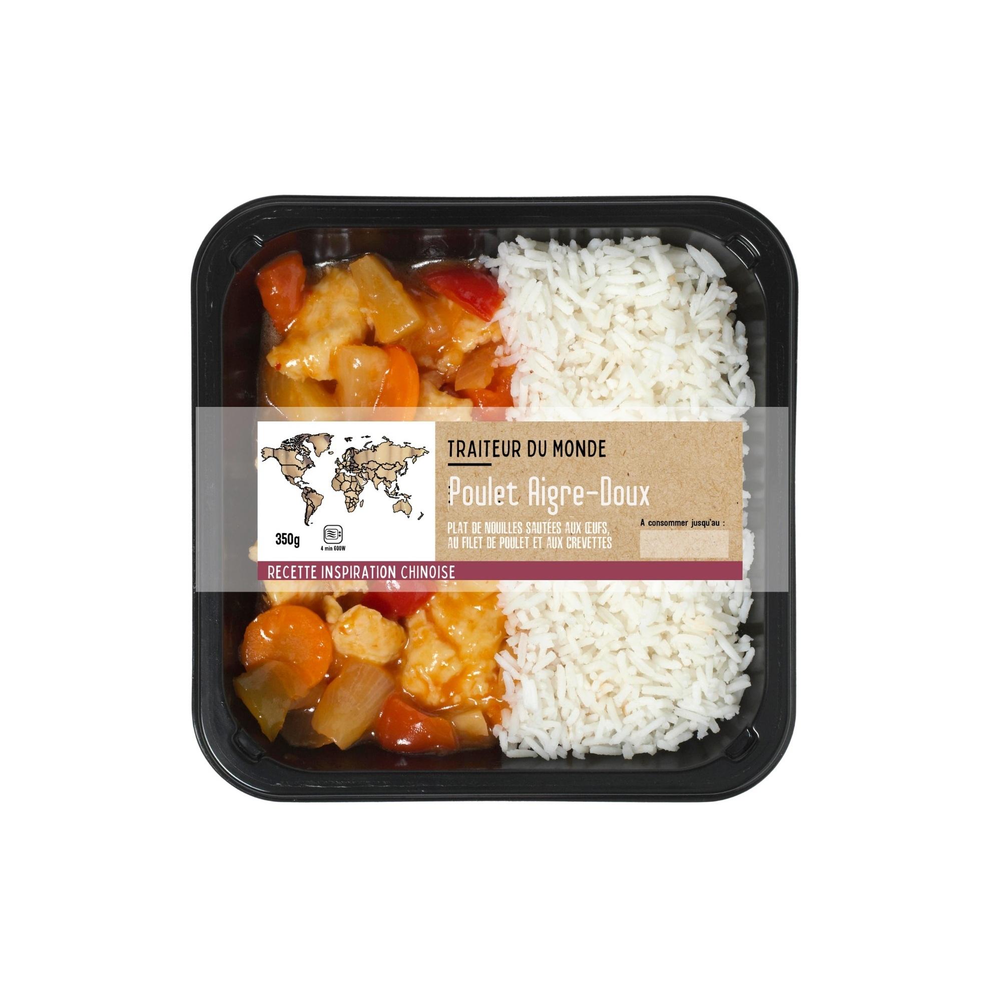 Plat préparé à base de viande de poulet à la sauce aigre-douce, assortiment
