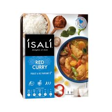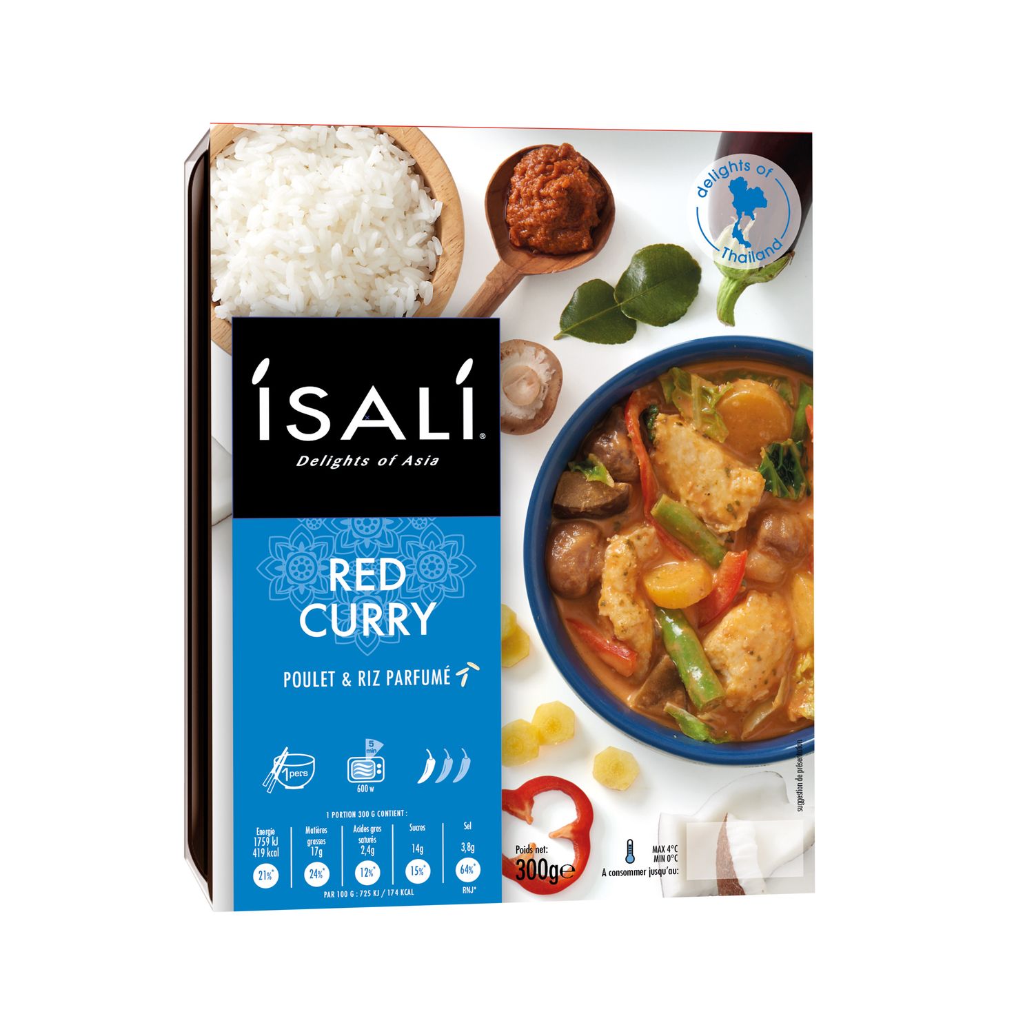 Red Curry 300 gr Isali Poulet Red Thai Curry et riz basmati, lait de coco, eau, pâtes de curry rouge, bambous, poivrons rouges, huile de soja, crème, œufs, fécule de pommes de terre, aromates, sucre, extrait de poisson, amidon de maïs, sel, feuilles de citron vert, stabilisants : farine de guar, gomme de xanthane, huile de tournesol. Accompagnement (40%): eau, riz parfumé, huile de soja, sel.