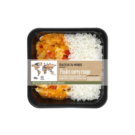 Recette authentique inspirée de la cuisine Thaï composée de tendres morceaux de filets de poulet, de quelques poivrons rouges, de bambous nappée d'une sauce curry rouge et lait de coco. Le tout accompagné de riz basmati.
