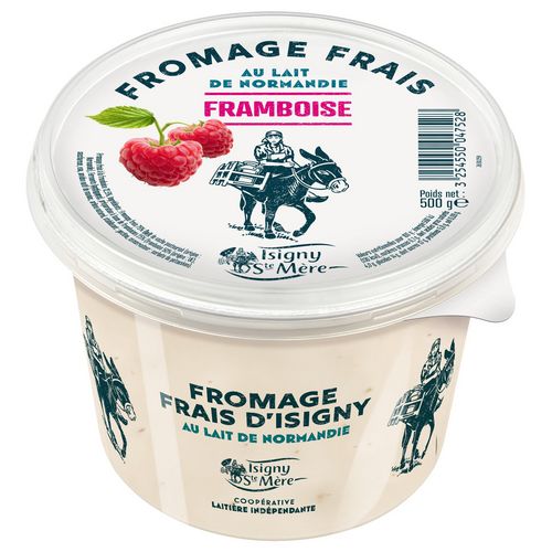 Ingrédients : Fromage frais 75% (LAIT de vache pasteurisé (Origine FRANCE)- Ferments (LAIT) - Préparation à base de framboises 25% (purée et brisure de framboises 50% (origine : UE / hors UE) - Saccharose - Eau - Amidon de Manioc Natif - Épaississant : Pectine de fruit, conservateur : sorbate de potassium, arômes naturel.).