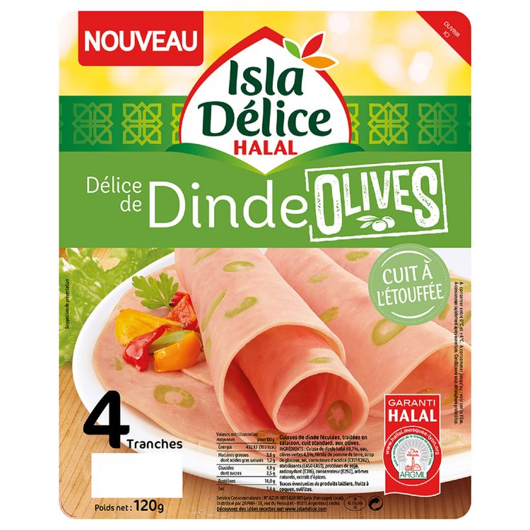 "Ingrédients : viande de dinde halal (origine UE) 69,7%, eau, olives vertes 4,5%, fécule de pomme de terre, sirop de glucose, sel, correcteurs d'acidité (E331 E262), stabilisants (E450 E451), protéines de SOJA, antioxydant (E316), conservateur (E250), arômes naturels, extrait d'épices.