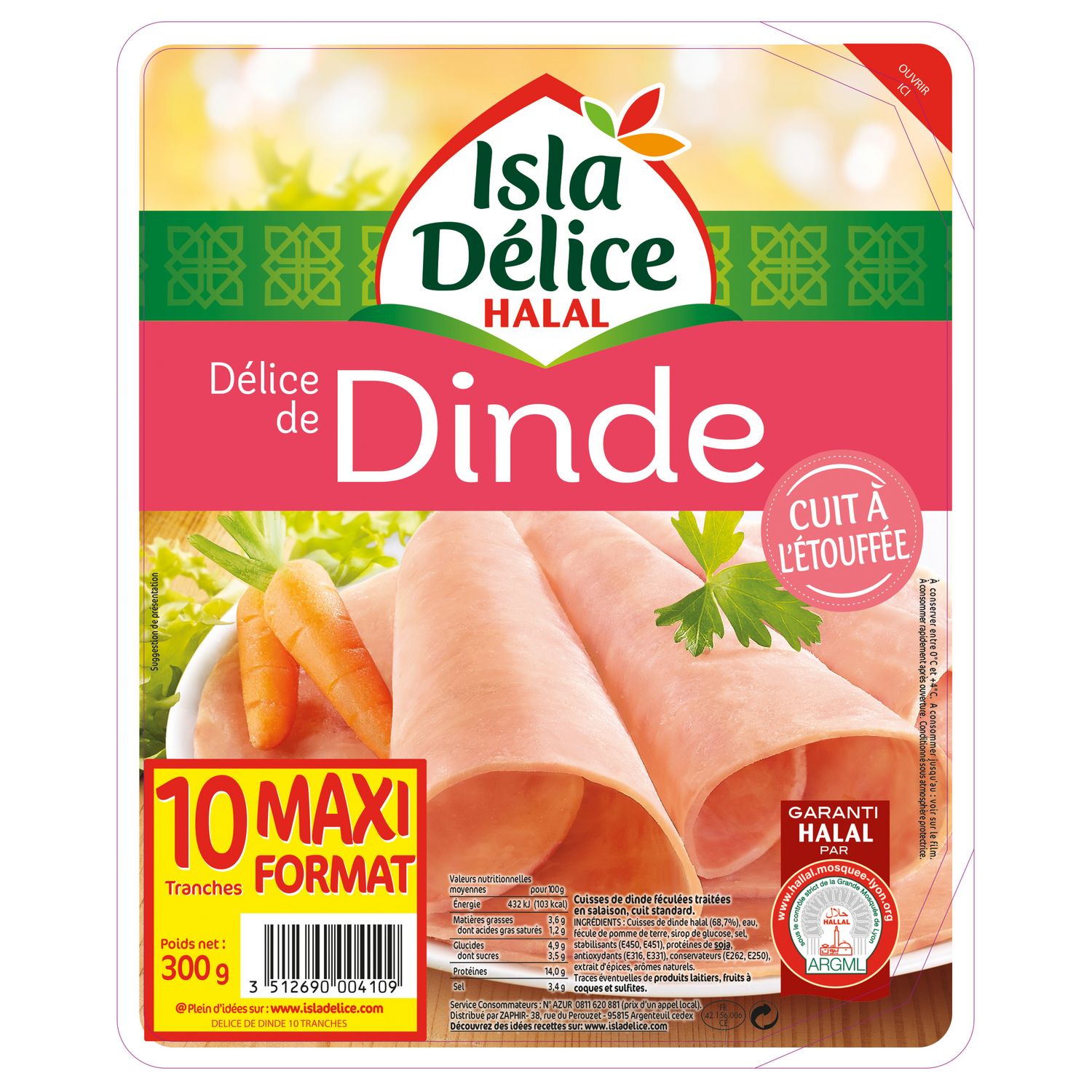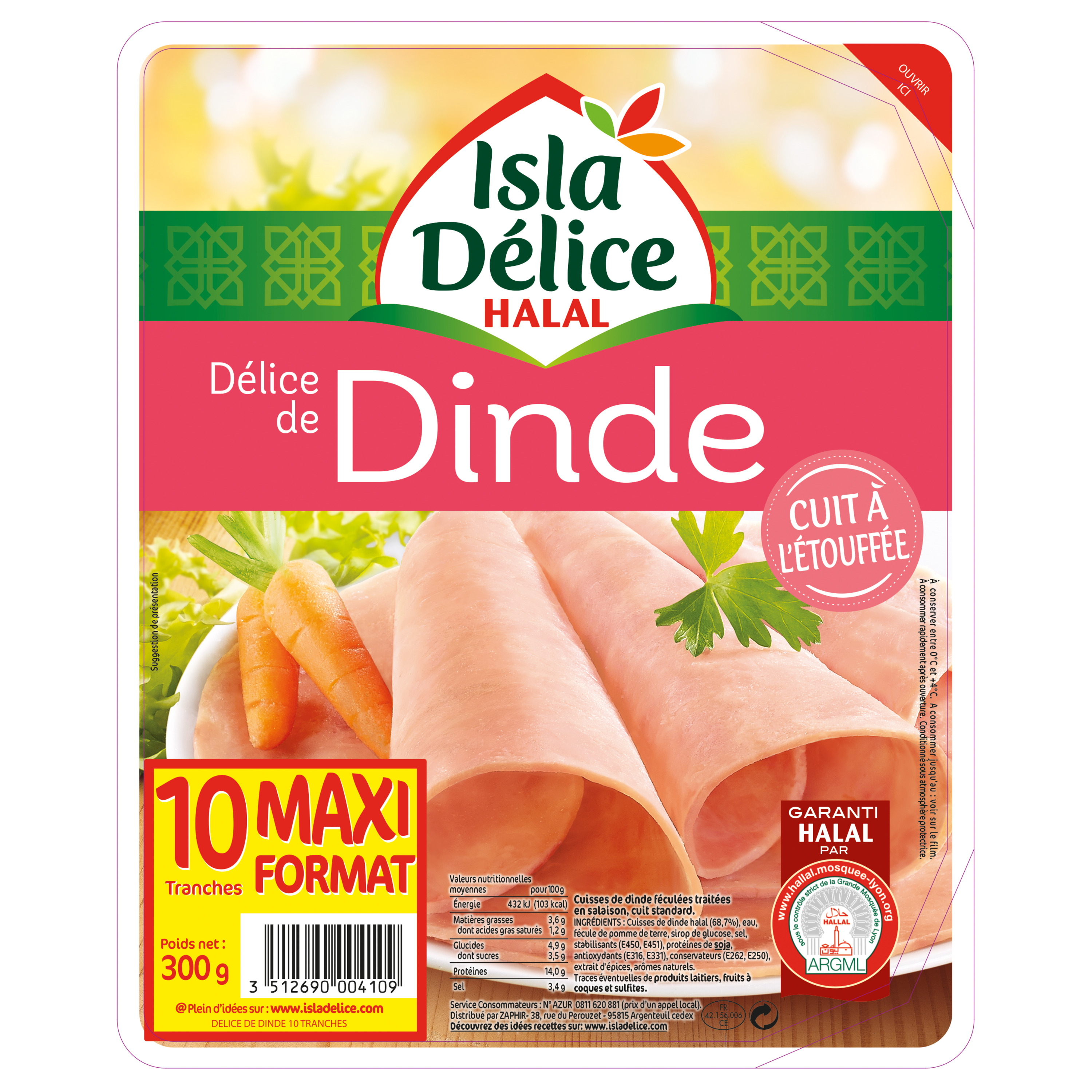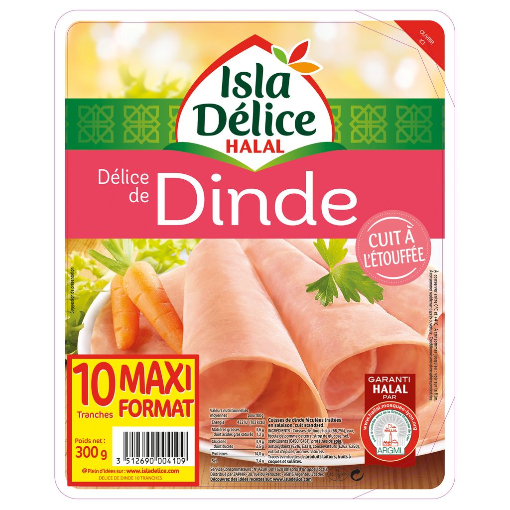 Cuisse de dinde halal (68,7%), eau, fécule de pomme de terre, sirop de glucose, sel, stabilisants (E450, E451), protéines de soja, antioxydants (E316, E331), conservateurs (E262, E250), extrait d'épices, arômes naturels. Traces éventuelles de produits laitiers, sulfites.