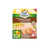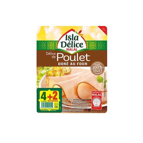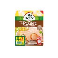 "Pour les amateurs de poulet bien doré, découvrez ou redécouvrez le Délice de poulet Doré au Four Isla Délice, 100% Halal ! Ces tranches fines bien moelleuses au beau fini doré font de ce produit un incontournable de notre gamme de jambons Halal. A déguster sans modération!"