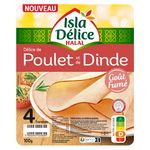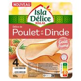 Filet de poulet halal (origine UE) 35,7%, filet de dinde halal (origine UE) 33%, eau, fécule de pomme de terre, sirop de glucose, sel, stabilisants (E450 E451), protéines de SOJA, antioxydants (E316 E331), conservateurs (E262 E250), arômes naturels, extrait d'épices, arôme de fumée. Traces éventuelles de lait.