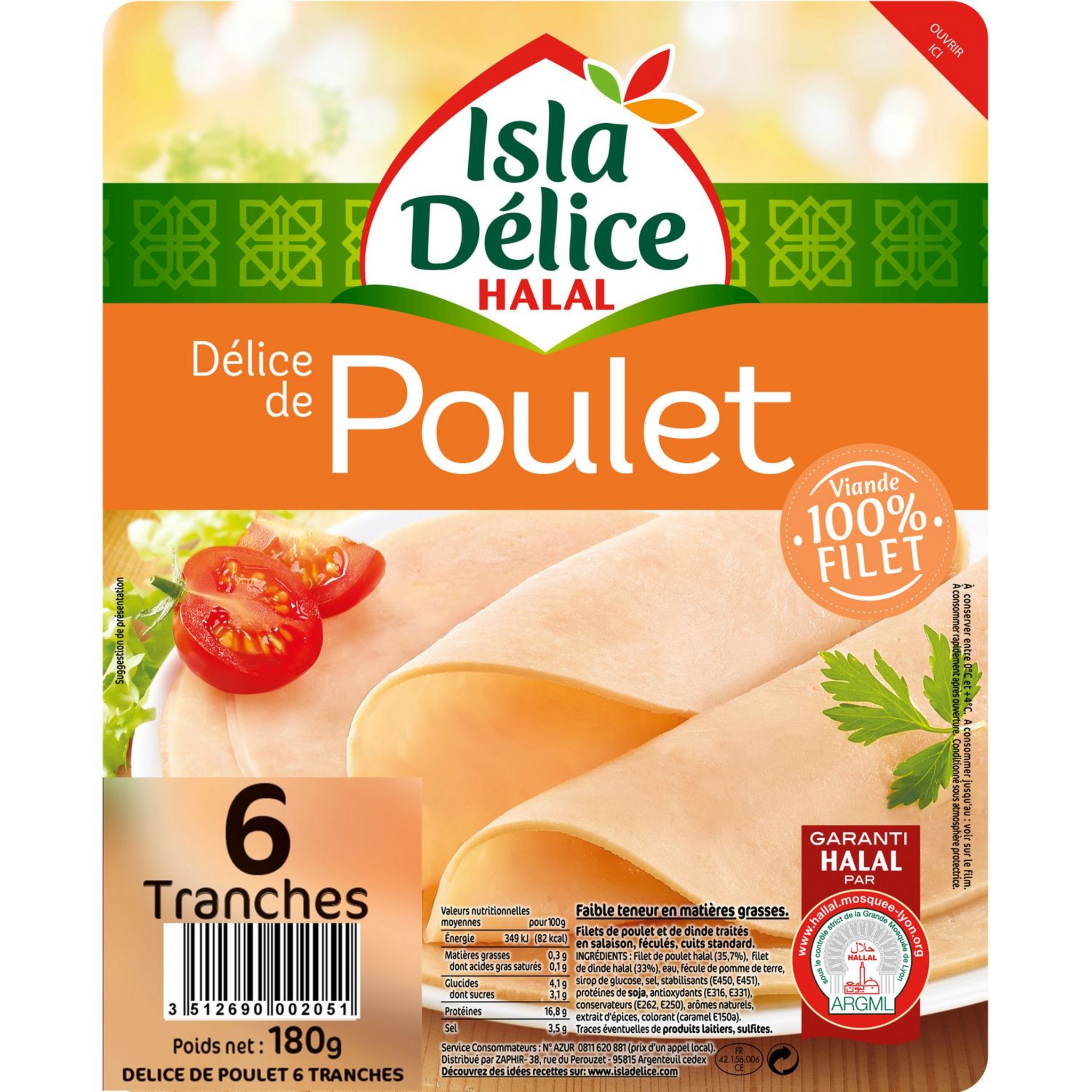 filet de poulet halal 35,7%, filet de dinde halal 33%, eau, fécule de pomme de terre, sirop de glucose, sel, stabilisants E450 E451, protéines de soja, antioxydants E316 E331, conservateurs E262 E250, arômes naturels, extrait d'épices, colorant : caramel E150a.