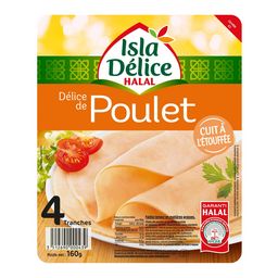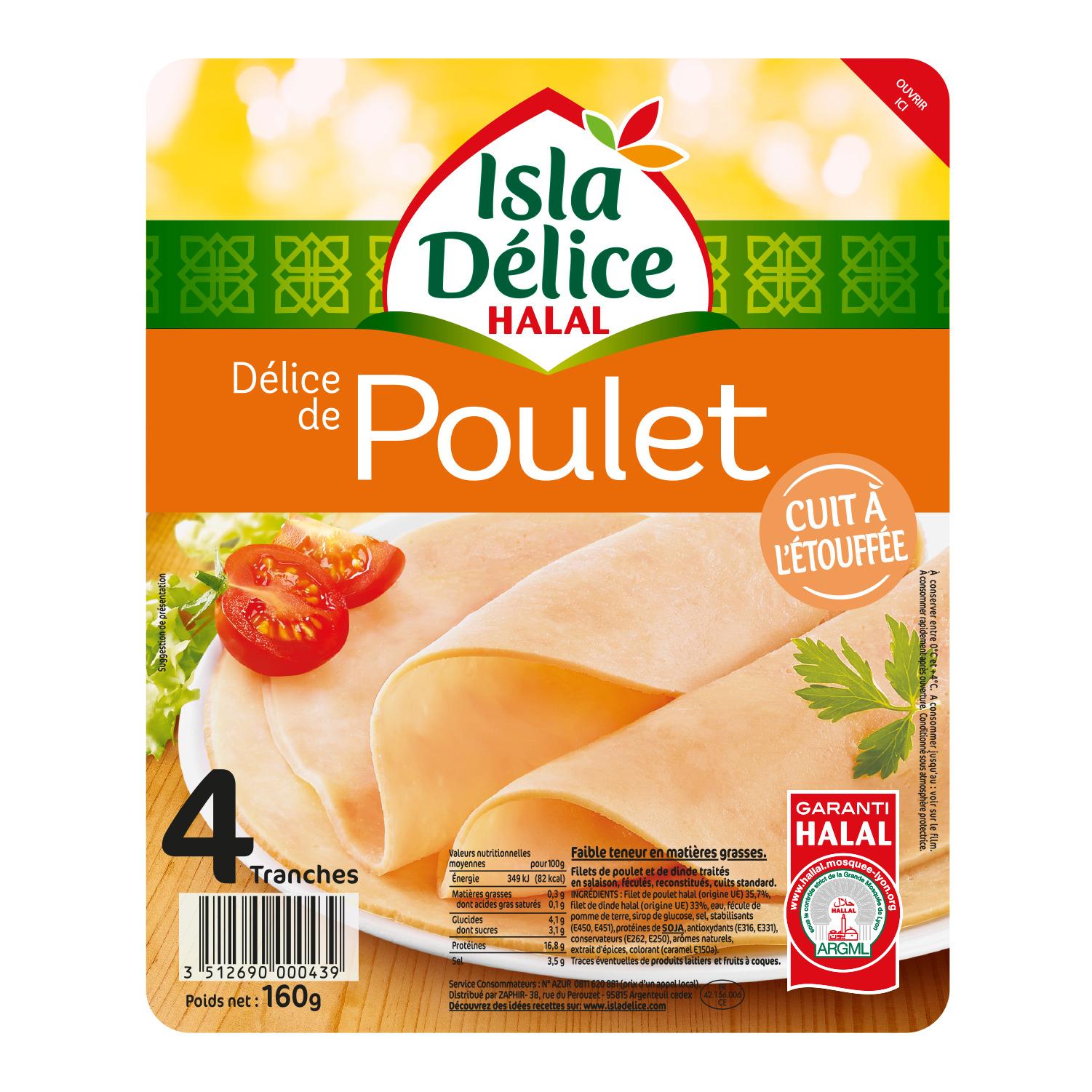 "Ingrédients : Filet de poulet halal (origine UE) 35,7%, filet de dinde halal (origine UE) 33%, eau, fécule de pomme de terre, sirop de glucose, sel, stabilisants (E450 E451), protéines de SOJA, antioxydants (E316 E331), conservateurs (E262 E250), arômes naturels, extrait d'épices. Traces éventuelles de produits laitiers."