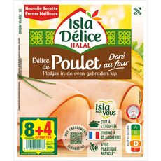 "Pour les amateurs de poulet bien doré, découvrez ou redécouvrez le Délice de poulet Doré au Four Isla Délice, 100% Halal ! Ces tranches fines bien moelleuses au beau fini doré font de ce produit un incontournable de notre gamme de jambons Halal. A déguster sans modération!"
