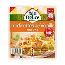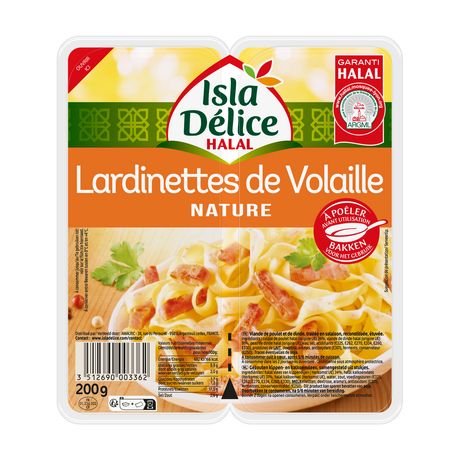 Cuisse de poulet halal (48%), cuisse de dinde halal (32%), eau, sel, sirop de glucose, conservateurs (E252, E250), antioxydant (E316). Traces éventuelles de SOJA, PRODUITS LAITIERS, FRUITS A COQUES, SULFITES.
