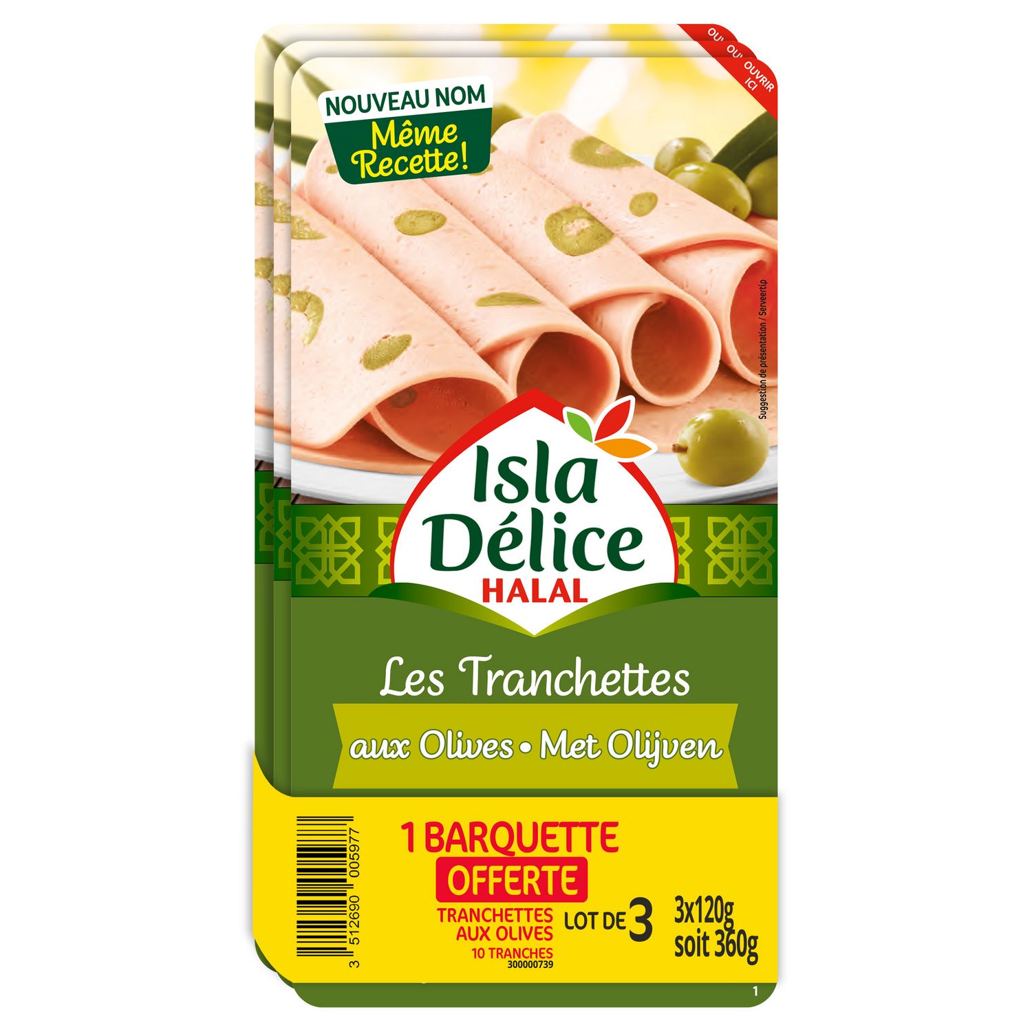Ingrédients : Viande séparée mécaniquement de poulet halal (origine UE) 41%, peau de dinde halal (origine UE), eau, amidon, olives vertes 5,3%, fibre de blé (sans gluten), dextrose, sel, conservateurs (E326 E262 E250), chlorure de potassium, épices, plante aromatique, antioxydant (E301). Traces éventuelle de soja, lait.