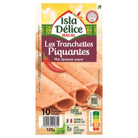 Ingrédients : Viande séparée mécaniquement de dinde halal (origine UE) 49%, peau de dinde halal (origine UE), eau, amidon, sel, piment 1,6%, dextrose, épices, paprika rouge, arômes naturels, stabilisants (E451 E450), tomate, oignon, exhausteur de goût (E621), antioxydants (E300 E301), conservateur (E250). Traces éventuelles de SOJA, LAIT.