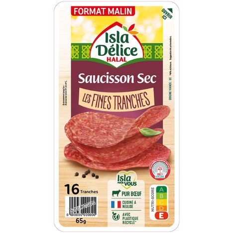 Ingrédients : Viande bovine halal (origine UE), sel, LACTOSE, dextrose, saccharose, stabilisant (E451), épices, plante aromatique, conservateurs (E252, E250), ferments. Traces éventuelles de SOJA. 130g de viande bovine mis en œuvre pour 100g de produit fini.