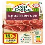 Dégustez le saucisson sec en tranches Isla Délice, à base de viande séchée dans les règles de l'art. Sa texture moelleuse et son goût unique en font un produit dont raffole toute la famille. A picorer en entrée, en pique-nique ou pour agrémenter vos raclettes.
