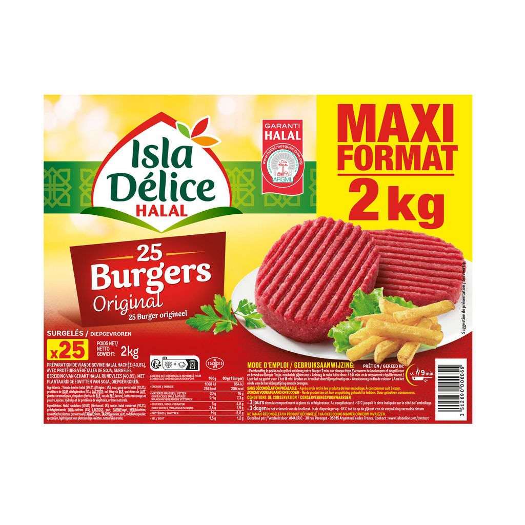 Ingrédients : Viande bovine hachée halal (origine UE) (51%), eau, protéines végétales de SOJA réhydratées (6%), lactose [LAIT], sel, fibre de BLE, protéines de LAIT, plantes aromatiques, chapelure [CEREALES CONTENANT DU GLUTEN], poudre de jus de betterave, épices, hydrolysat de protéines végétales, arômes naturels.