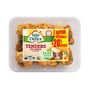 Préparation à base de viande de dinde traitée en salaison aromatisée et reconstituée, enrobée de panure frite et cuite.