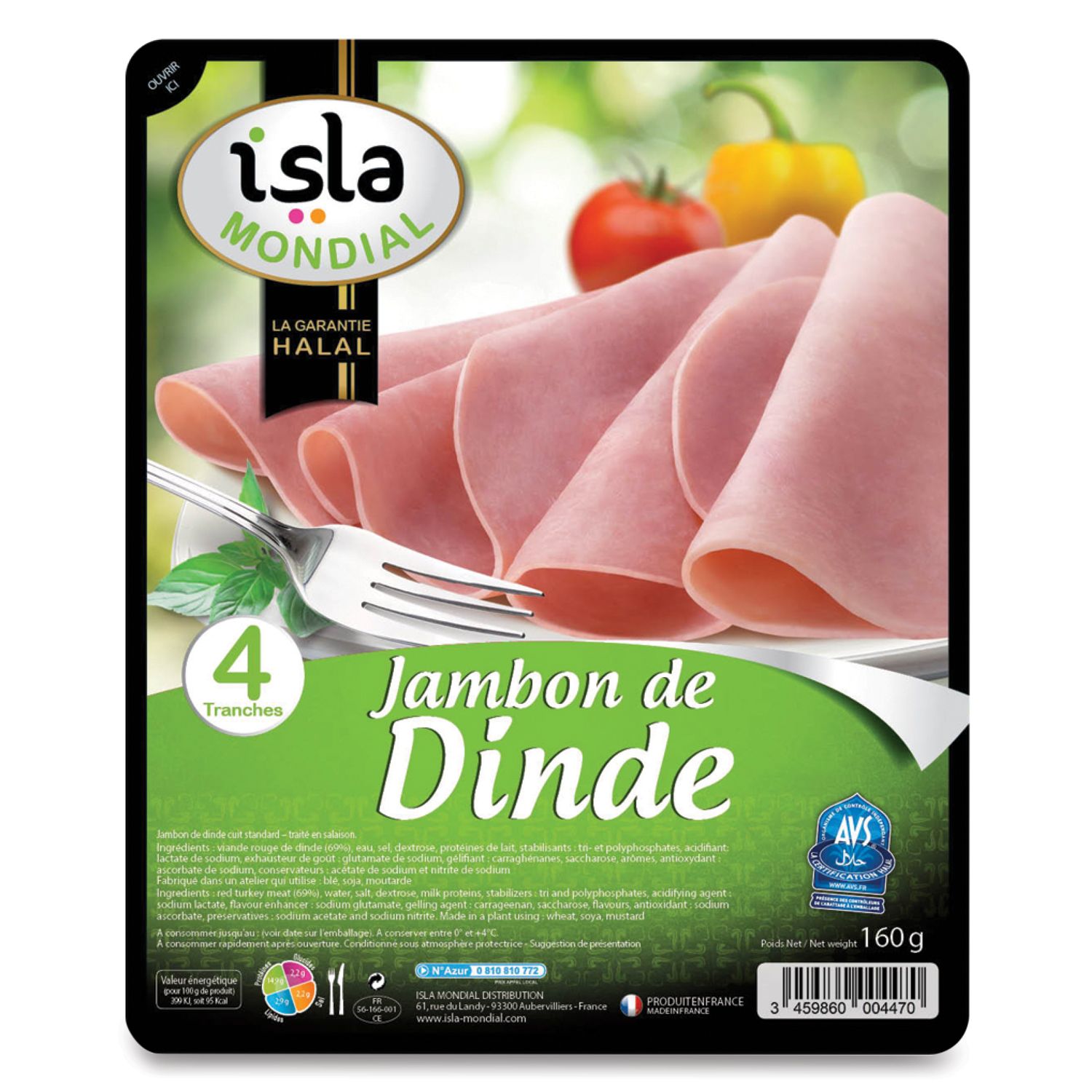 Ingrédients : viande rouge de dinde (69%), eau, dextrose, sel, protéines de LAIT, stabilisants : tri- et polyphosphates, conservateurs :lactate de potassium, acétate de sodium et nitrite de sodium, gélifiant : carraghénane semi-raffinée, saccharose, arôme naturel, antioxydant : ascorbate de sodium, extrait d’épices. Viande origine U.E.