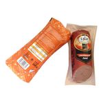 Ingrédients : viande de volaille (51%), eau, viande séparée mécaniquement de volaille, fécule (10%), protéines de SOJA réhydratée, sel, conservateurs : lactate de sodium, acétate de sodium et nitrite de sodium, dextrose, stabilisants : tri- et diphosphates, ail (0,6%), épices et colorant : rouge de betterave, arômes, antioxydant : érythorbate de sodium.