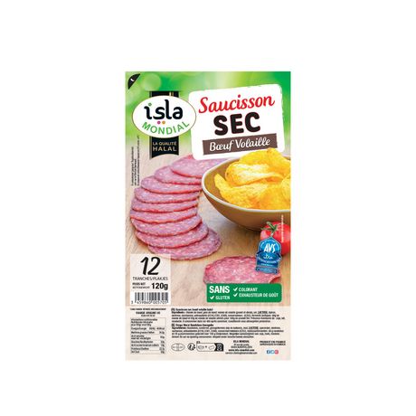 Idéal pour vos préparations culinaires ou vos soirées raclettes, régalez-vous avec le saucisson sec bœuf et volaille Halal d’Isla Mondial. Préparé en France, sans gluten, sans colorant et sans exhausteur de goût.
