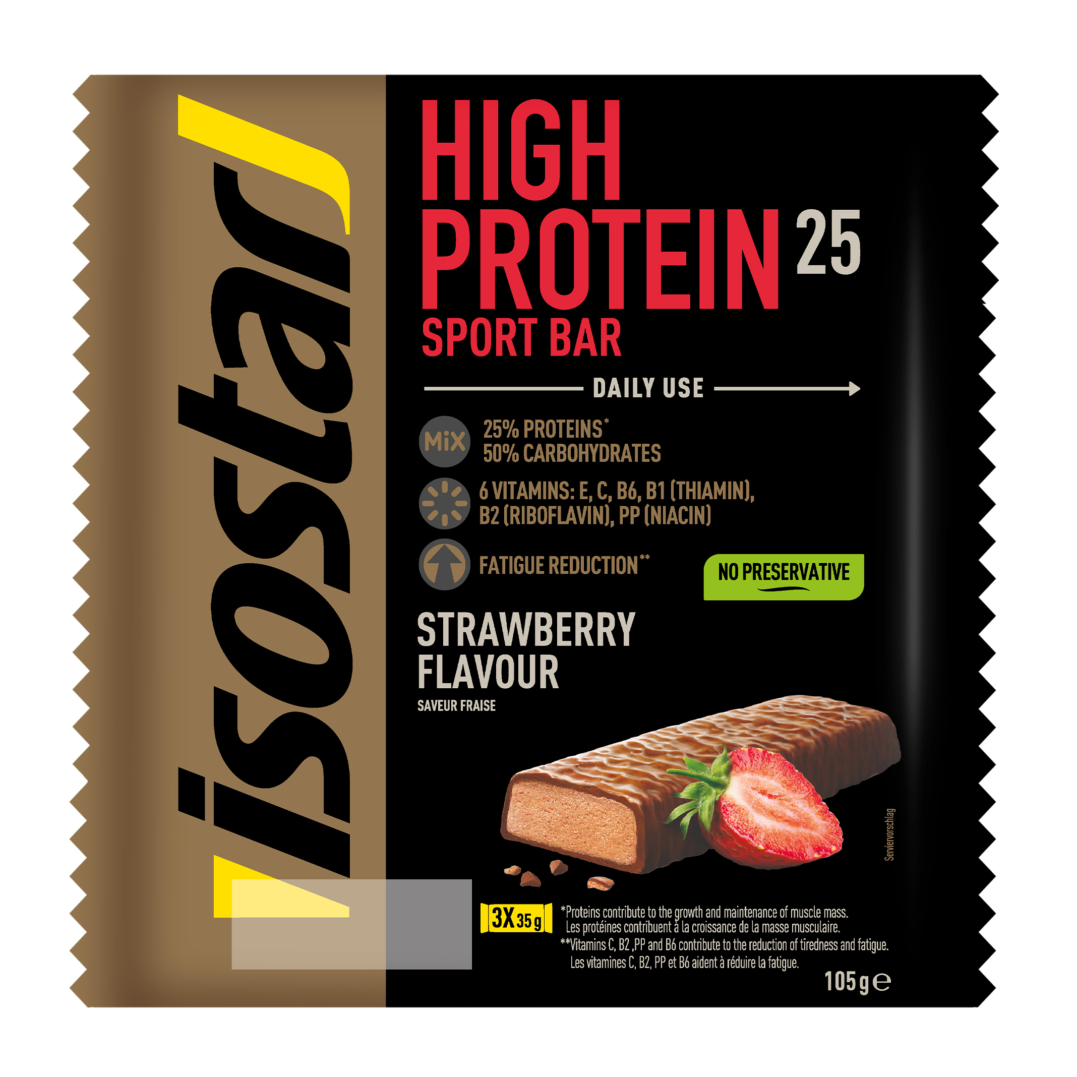 Les barres HP 25 vous apportent des protéines qui contribuent à maintenir et augmenter votre masse musculaire, des glucides pour vous fournir de l'énergie pendant l'effort musculaire mais aussi des vitamines.