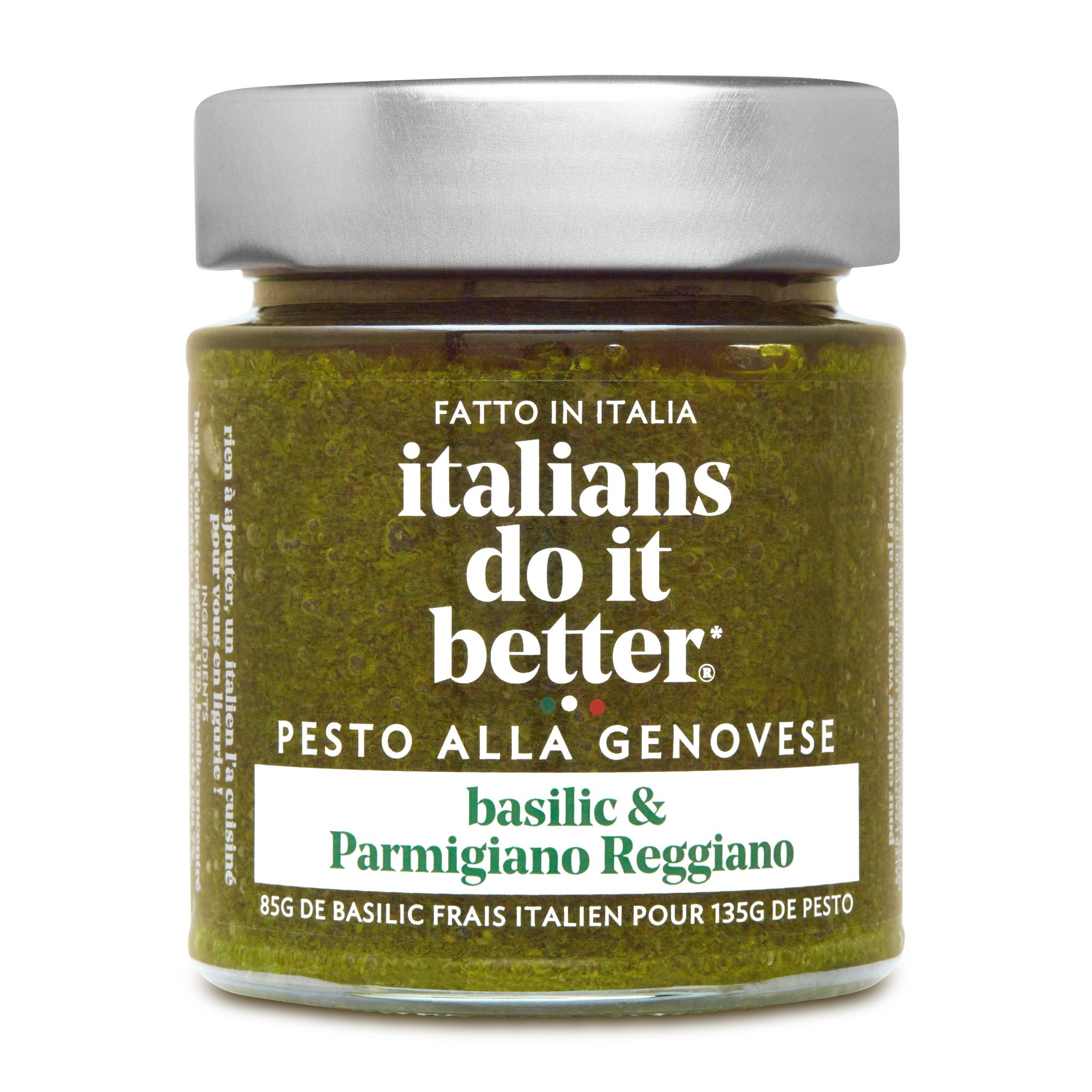Recette traditionnelle du pesto alla genovese. Parmigiano Reggiano AOP, huile d’olive, pignons de pin entiers. 85g de basilic frais italien pour 135g de pesto.