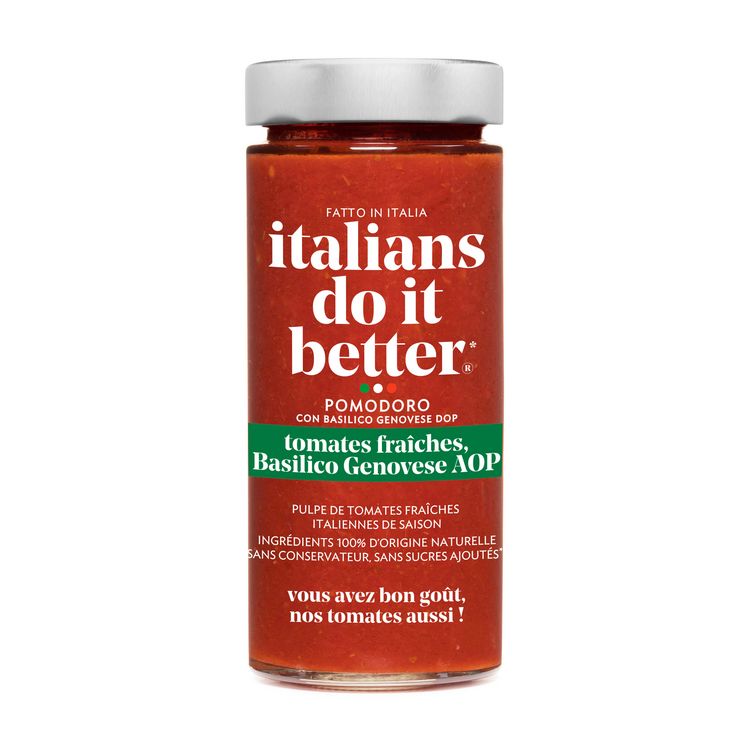 Notre sauce Pomodoro, à base de tomates fraîches italiennes de saison et de Basilico Genovese AOP. Sans sucres ajoutés, sans additifs ni conservateurs. Rien à ajouter, un italien l'a cuisinée pour vous dans le Piémont !