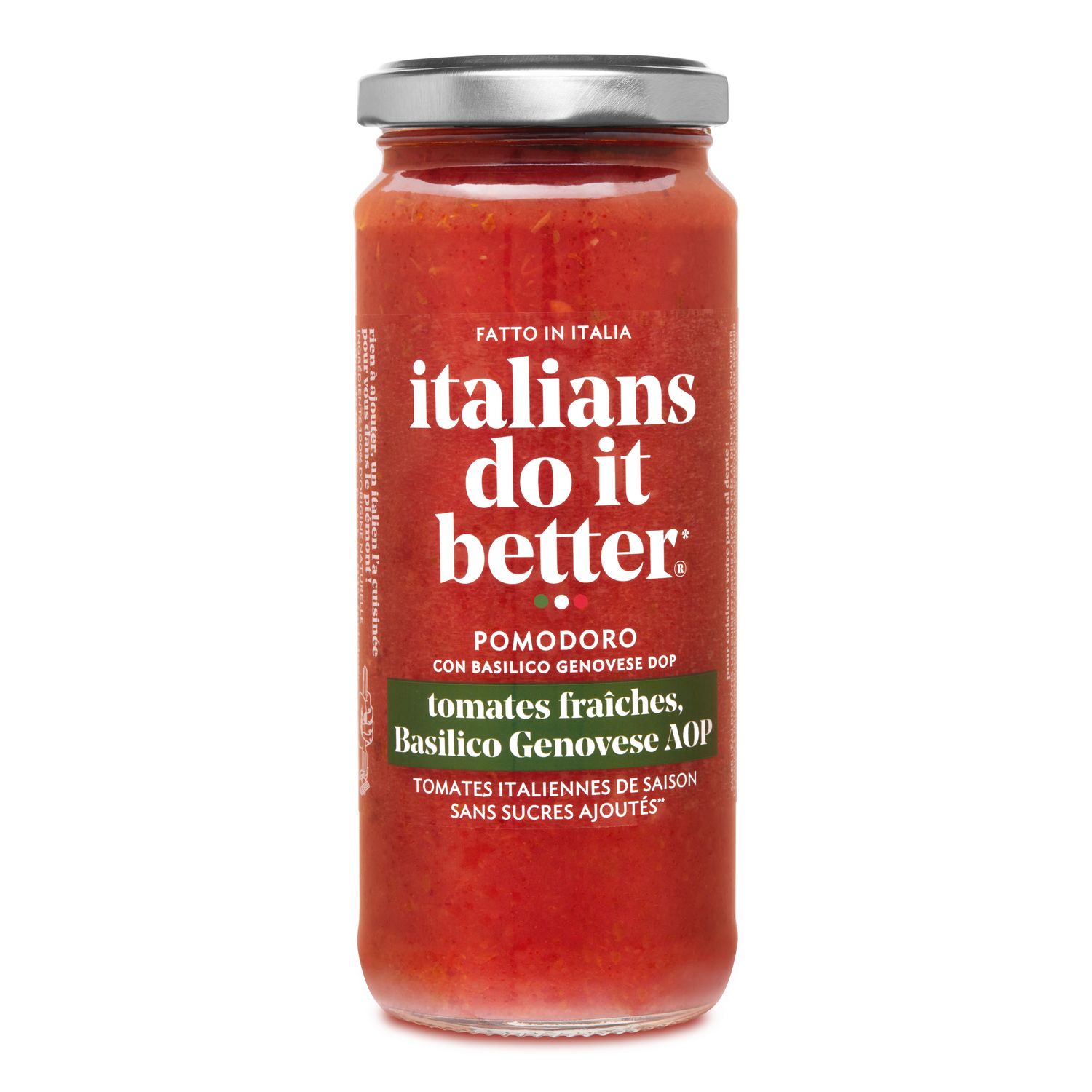 Notre sauce Pomodoro, à base de tomates fraîches italiennes de saison et de basilico genovese AOP. Sans sucres ajoutés, sans additifs ni conservateurs. Rien à ajouter, un italien l'a cuisinée pour vous dans le Piémont !