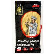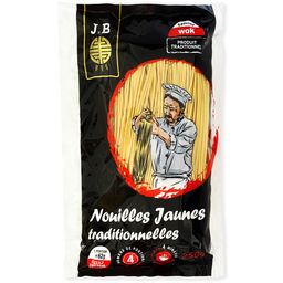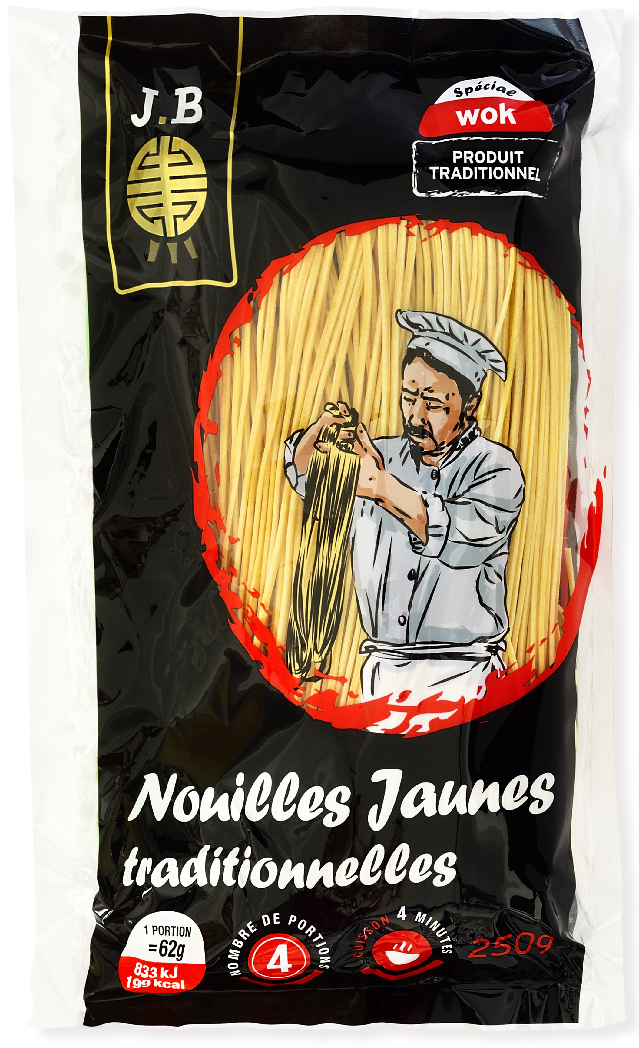 Nouilles jaunes traditionnelles chinoises Nos nouilles traditionnelles JB sont un élément de base de la cuisine asiatique. Fait à partir d'Ingrédients simples (farine de blé, sel et curcuma), ses utilisations sont diverses : au wok, à la poêle, avec des légumes, viandes, poissons… A assaisonner avec de la sauce soja, pad thaï ou autres sauces asiatiques.