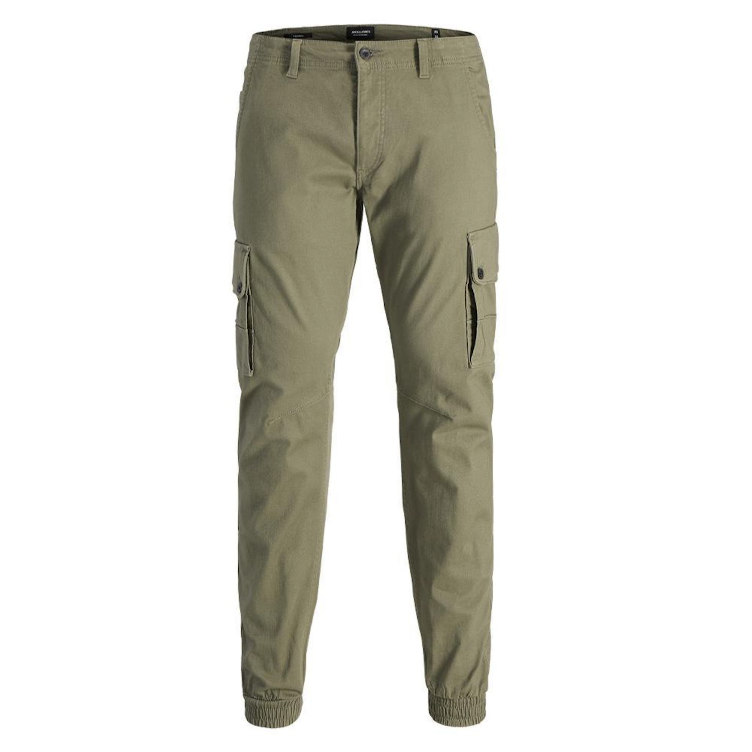 Craquez pour le pantalon de la marque Jack & Jones !- Coloris : Kaki- Pantalon cargo- Poches boutonnées sur les cuisses- Poches latérales- Passants pour ceinture- Elastique de maintien sur le bas des jambes- Composition : 98% coton, 2% élasthanne