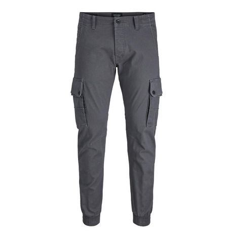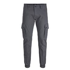 Craquez pour ce pantalon homme de la marque Jack & Jones !Couleur : GrisPantalon cargoPoches boutonnées sur les cuissesPoches latéralesPassants pour ceintureElastique de maintien sur le bas des jambesComposition : 98% coton, 2% élasthanneAttention, les tailles indiquées correspondent aux tailles US