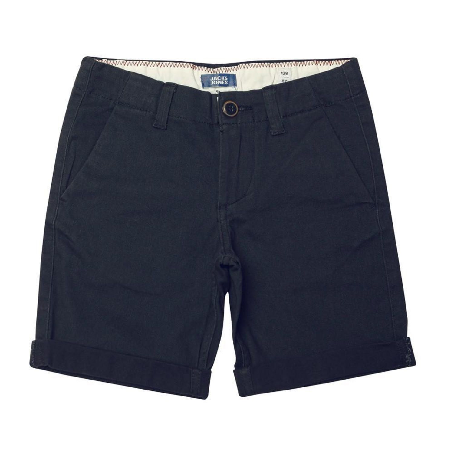 Découvrez ce short pour Garçon de la marque JACK & JONES ! Couleur : Marine Coupe regular Braguette zippée Passants pour ceinture 4 poches Composition : 98% coton, 2% élasthanne