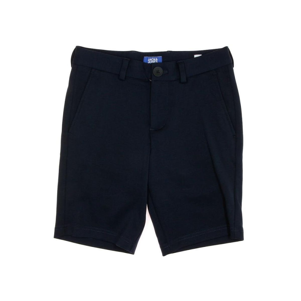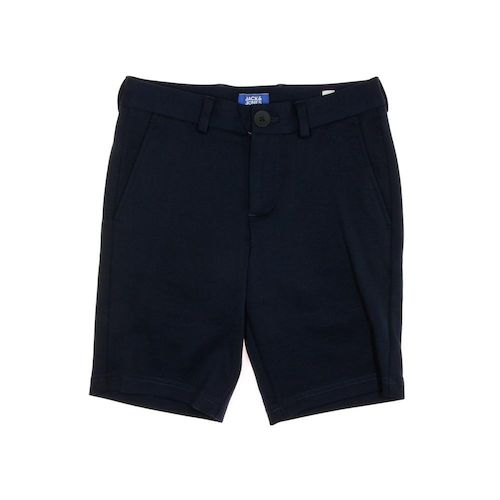 Short garçon de la marque Jack & Jones- Fermeture bouton et zip- 4 poches- Coloris : Bleu Marine- Composition : 75% polyester , 22% viscose , 3% élasthanne
