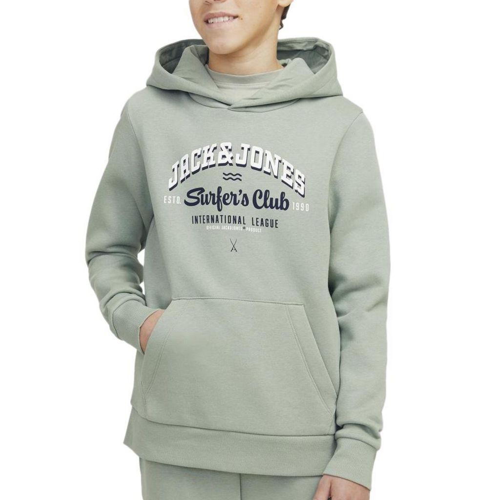 Sweat garçon de la marque Jack & Jones !Manches longuesCapuche1 poche kangourouColoris : Vert Logo sur l'avantComposition : 69% coton , 30% polyester , 1% viscose