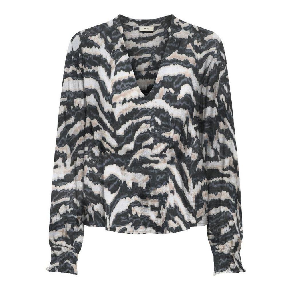 Optez pour la blouse femme JDY !Manches longuesCol VImpriméColoris : Noir/BeigeTissu fluideComposition : 87% viscose , 13% nylon
