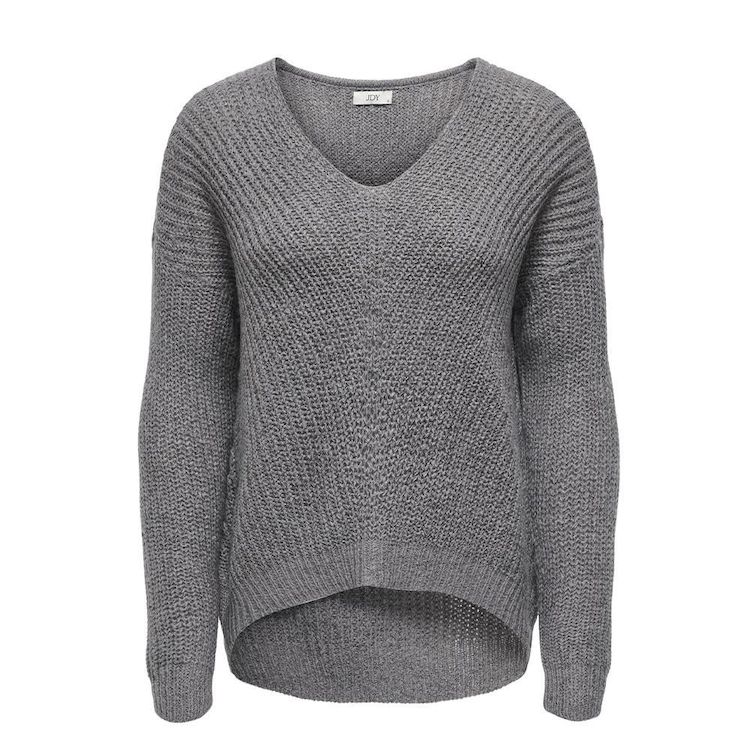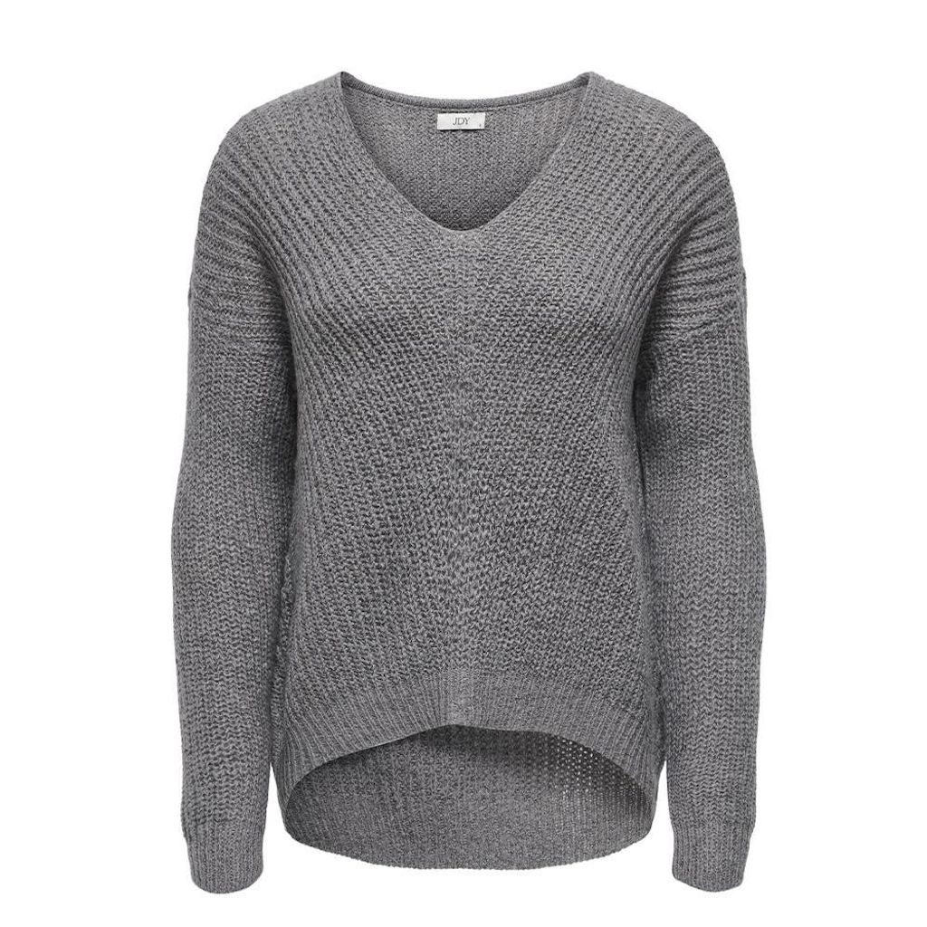 Pull doux pour femme de la marque Jacqueline de Yong Coloris : GrisComposition : 88% acrylique , 12% polyesterlégèrement Oversized , Plus court à l'avant qu'à l'arrière Col V
