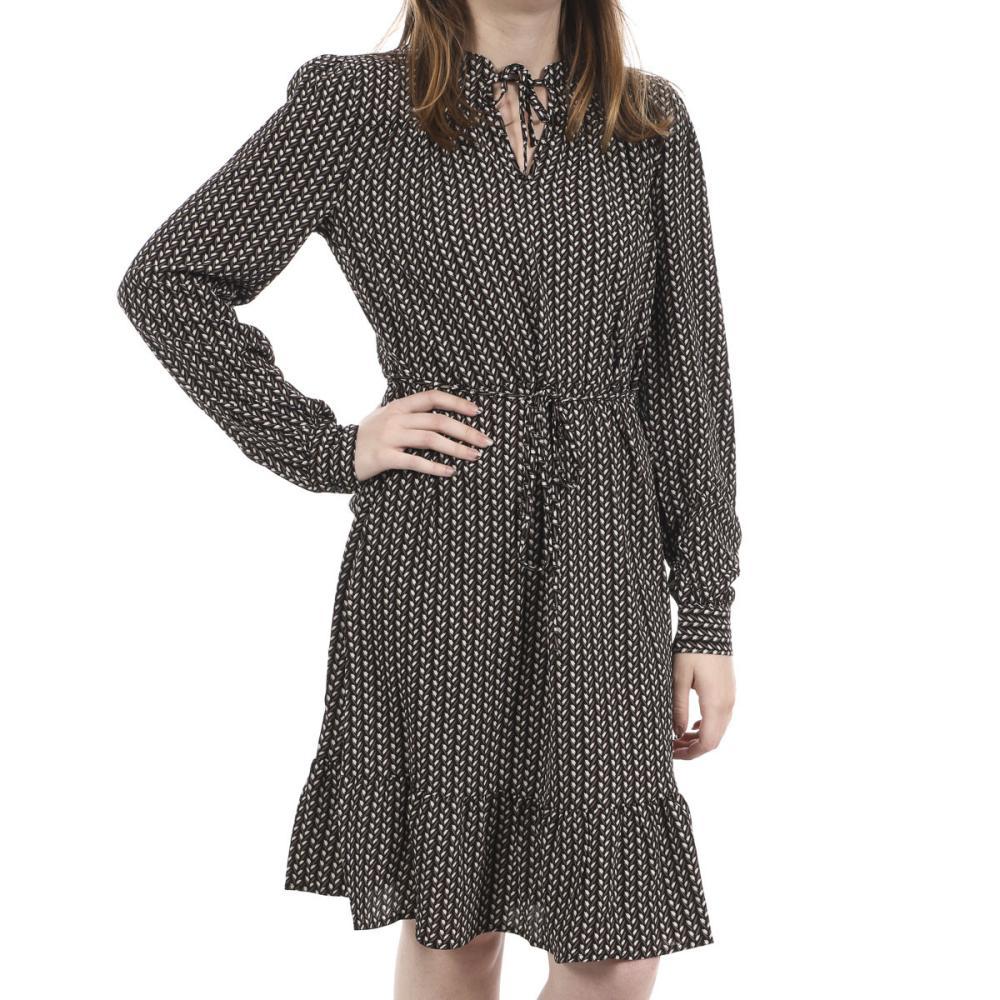 Optez pour la robe femme de la marque Jacqueline de Yong Manches longues Col V avec lien Ceinture à la taille Détail volant sur le bas Imprimé Coloris : Noir Composition : 97% polyester , 3% élasthanne