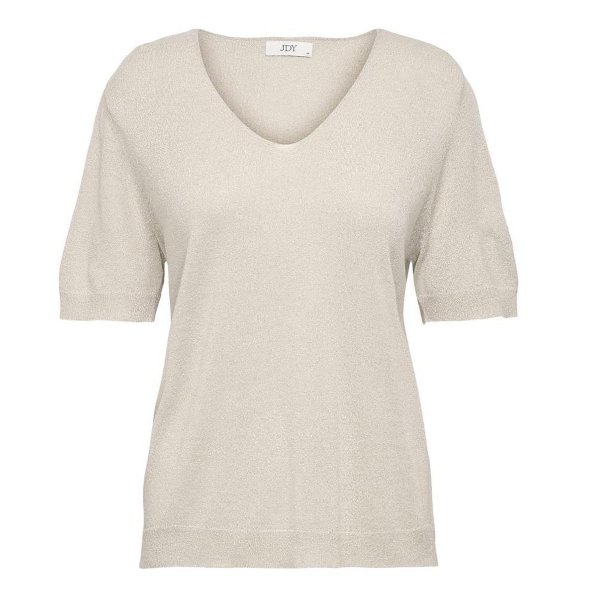 Optez pour ce t-shirt JDY à prix bas !- Coloris : Beige- Col V- Manches courtes- Composition : 45% acrylique, 45% viscose, 10% fibres métalliques- Effet pailleté