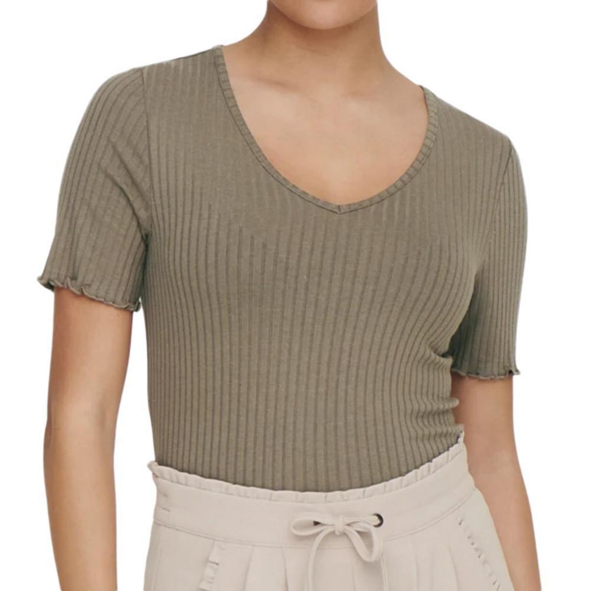 Craquez pour ce top de la marque JDY ! Col V Coloris : Marron Manches courtes Tissus côtelé Bords côtelés Composition : 75% Viscose 20% Coton 5% Élasthanne