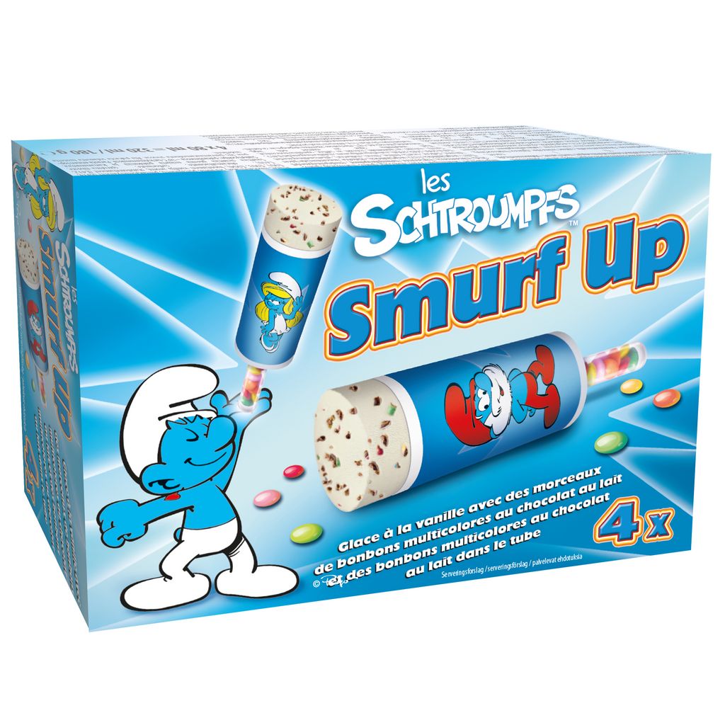 Les Schtroumpfs – Glace à la vanille (78,2 %) avec des morceaux de bonbons multicolores au chocolat au lait (9,6 %) et décoré avec des bonbons multicolores au chocolat au lait (12,2 %) dans le tube.