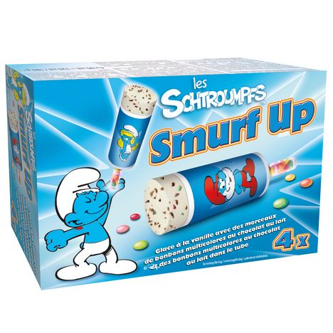 Les Schtroumpfs – Glace à la vanille (78,2 %) avec des morceaux de bonbons multicolores au chocolat au lait (9,6 %) et décoré avec des bonbons multicolores au chocolat au lait (12,2 %) dans le tube. Ingrédients