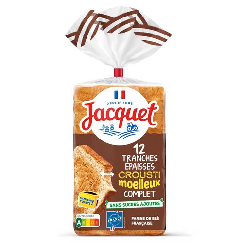 Les Crousti Moelleux Complet Jacquet, des tranches de pain de mie épaisses à toaster au grille pain pour une mie moelleuse à l'intérieur et croustillante à l'extérieur.
