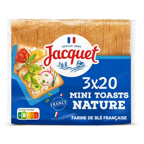 Nos Mini Toasts Nature Jacquet sont idéals pour la réalisation de vos apéritifs et de vos entrées. Moelleux et faciles à tartiner, vous pourrez les agrémenter selon vos envies en version salée ou sucrée, chauds ou froids. Une recette Nutriscore B, sans huile de palme et Origine France Garantie.