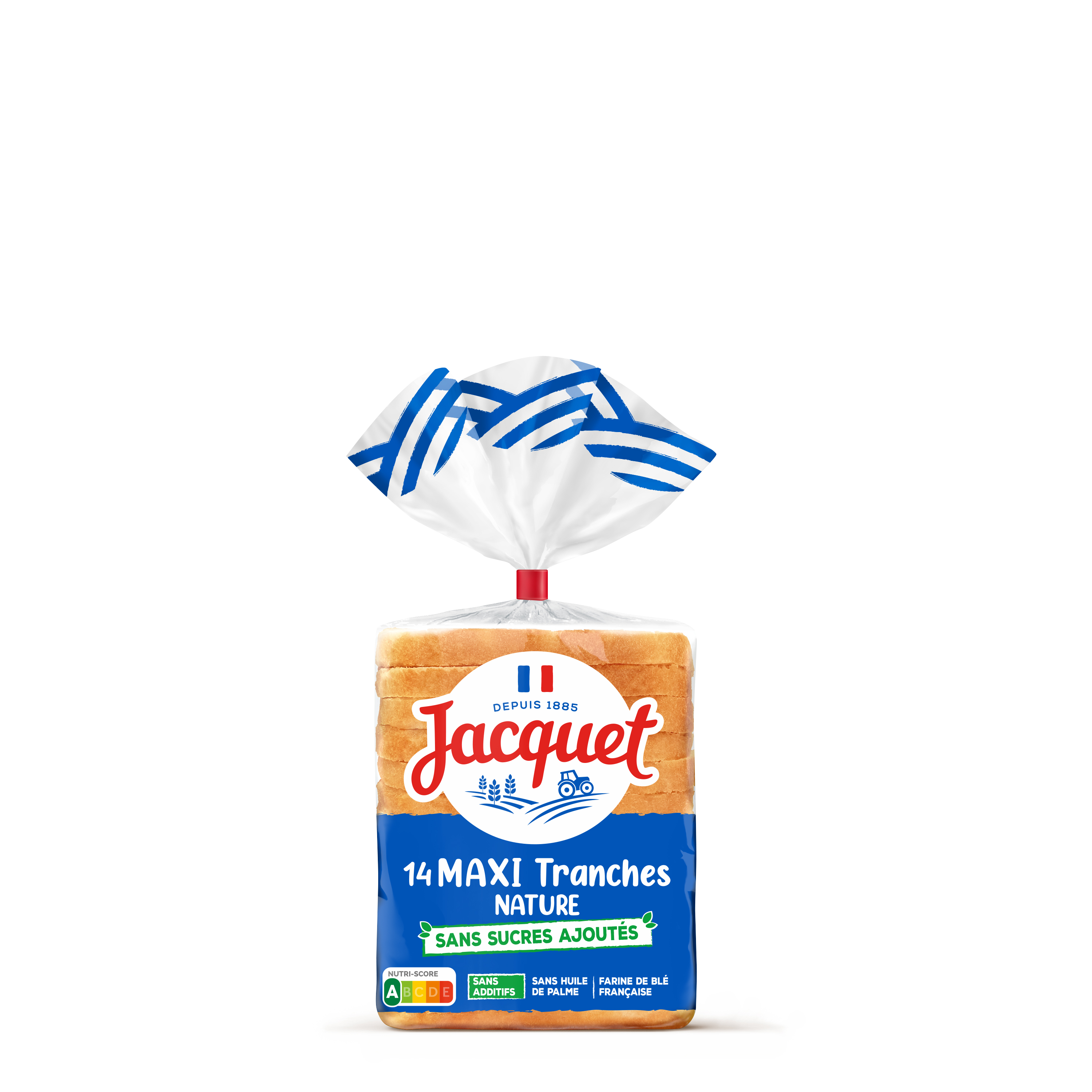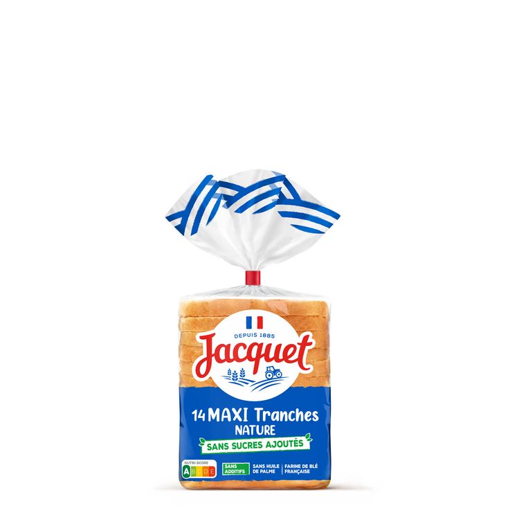 Les grandes tranches Sans Sucres Ajoutés Nature Jacquet, au bon goût et toujours aussi moelleuses ! Un pain de mie fabriqué en France avec du blé français, sans sucres ajoutés et Nutriscore A. A marier aussi bien avec des saveurs sucrées que salées
