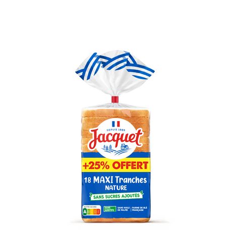 Depuis 216, Jacquet propose du Pain de mie Sans Sucres Ajoutés pour toute la famille. En mars 22, Jacquet va plus loin, avec une gamme de Pain de mie intégralement Sans Sucres Ajoutés* et Nutriscore A*.