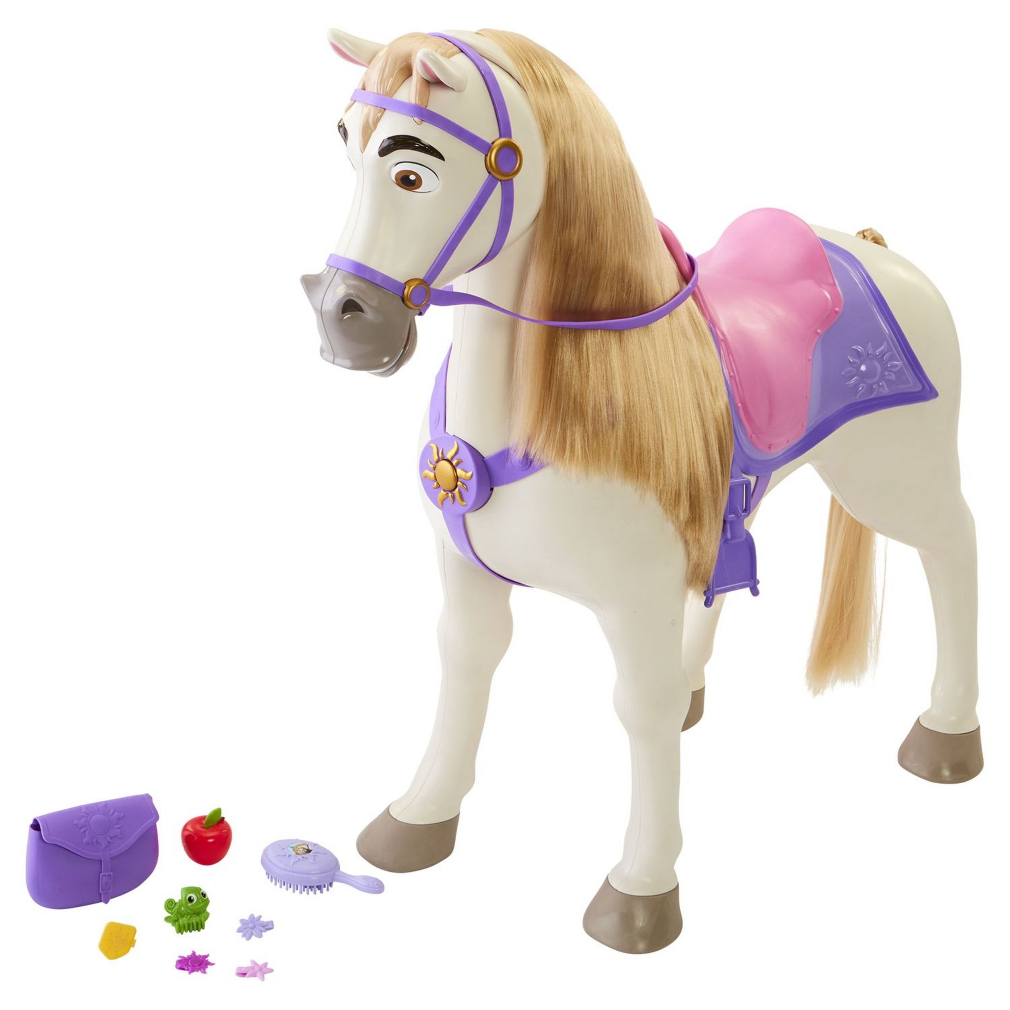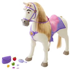 Retrouve Maximus, le cheval et fidèle compagnon de Raiponce. Il mesure 80 cm. Tu pourras t'occuper de lui, il adore qu'on prenne soin de lui ! Tu pourras le peigner, décorer sa crinière de jolies décorations....Il tire les rênes, fait du trop et du galop ! Grâce à lui réalise tes rêves de princesse